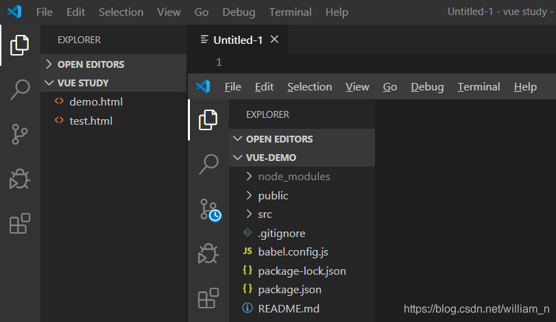 2.2 同时打开多个项目在正常情况下vscode一般只能打开一个项目, 快捷键:shift+ctrl +n 如下所示, 成功打开. 或者 file->open new window [文件->新建窗口]