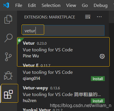 3.1 安装vue类型识别插件, 对.vue文件会有语法高亮, 而且支持保存自动格式化代码[即按下ctrl+S即可]vetur 输入vetur