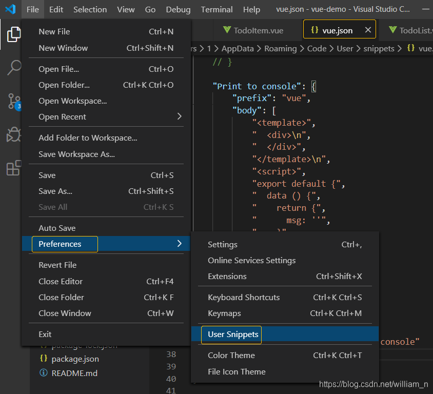 2.3 快速生成vue代码片段前提:安装有识别vue文件的插件,如vetur 见下方插件栏 a. 打开vscode,找到用户代码片段,选择vue.json文件打开,如下图