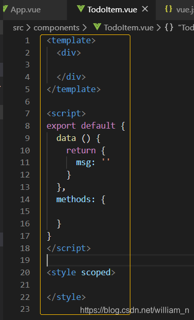 c. 将以下代码复制粘贴到vue.json里面,保存 //这里使用第一种 { "Print to console": { "prefix": "vue", "body": [ "<template>", " <div>\n", " </div>", "</template>\n", "<script>", "export default {", " data () {", " return {", " msg: ''", " }", " },", " methods: {\n", " }", "}", "</script>\n", "<style scoped>\n", "</style>\n" ], "description": "Log output to console" } } 或者 { "Print to console": { "prefix": "vue", "body": [ "<!-- $1 -->", "<template>", "<div></div>", "</template>", "", "<script>", "export default {", "data() {", "return {", "", "}", "},", "//生命周期 - 创建完成(访问当前this实例)", "created() {", "", "},", "//生命周期 - 挂载完成(访问DOM元素)", "mounted() {", "", "}", "}", "</script>", "<style scoped>", "/* @import url(); 引入css类 */", "$4", "</style>" ], "description": "Log output to console" } } d. 新建 xxx.vue文件,输入 vue 然后回车,即可快速生成vue代码片段