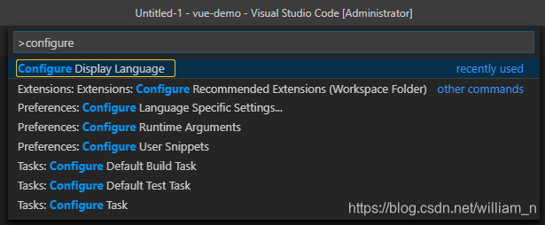 2.5 显示中文语言 // 但是不推荐, 一直显示中文[最好稍微熟悉之后, 仍然使用语言英文版]1. 按下shift+ctrl+p 打开搜索框, 输入 configure 找到配置语言显示配置项.