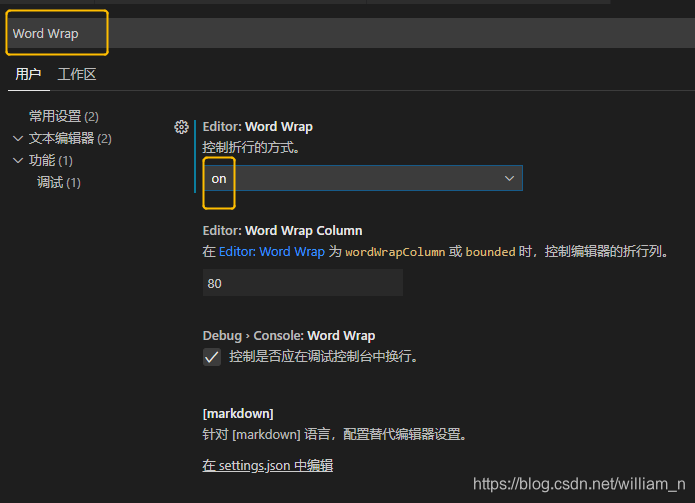 2.7 VScode如何自动换行设置临时自动换行显示:// 关掉窗口或者vscode 恢复原样 查看--> 切换自动换行 //或者直接按Alt+Z 永久自动换行显示: 进入文件>首选项>设置,打开设置界面,在常用设置下 [可以直接搜索Word Wrap] 找到Editor:Word Wrap选项, 默认为off, 设置为on即可。