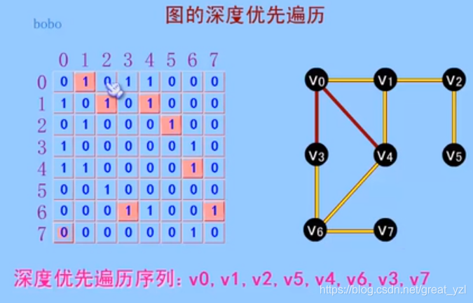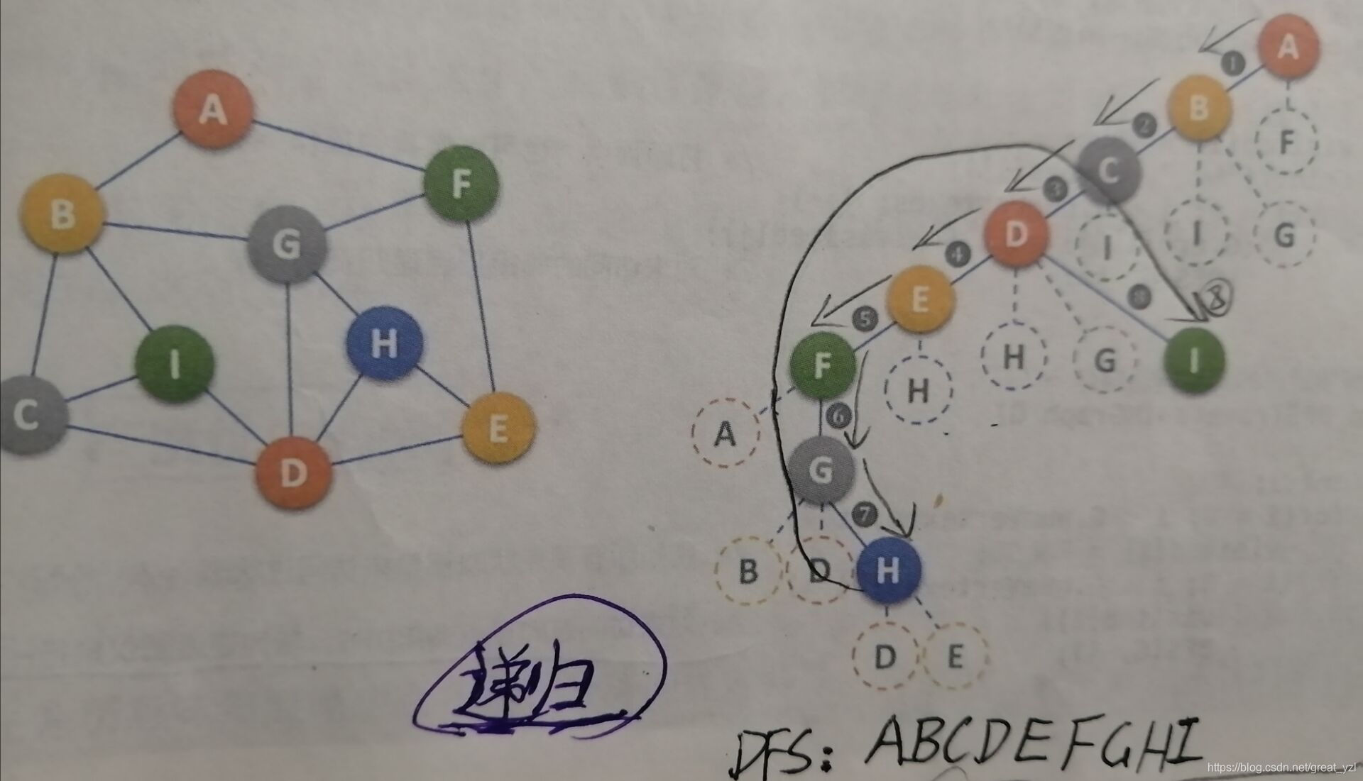 DFS(深度优先遍历): 以一个顶点为根,逐顶点地往下遍历,遇到没遍历过的顶点则继续遍历;遇到遍历过的顶点则回溯。(递归实现)