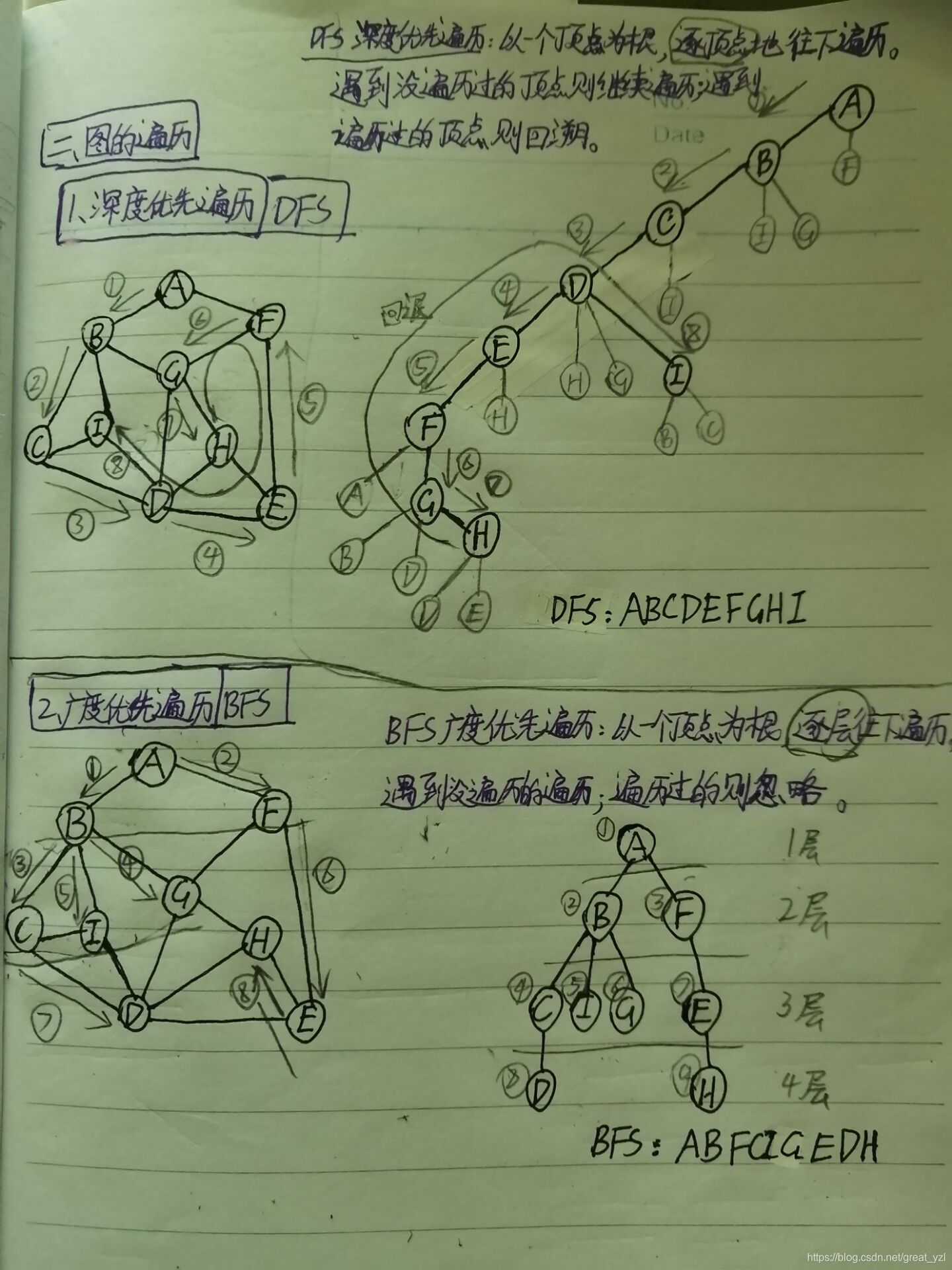 BFS(广度优先遍历):以一个顶点为根,逐层地往下遍历,遇到遍历的顶点遍历;遍历过的顶点则忽略。(队列实现)