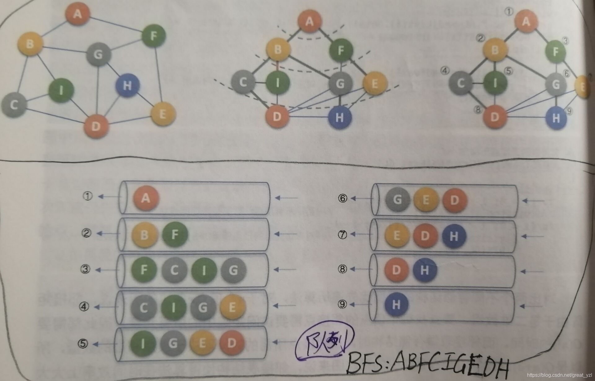 原理和上面的邻接矩阵类似,以顶点为单位,往后判断是否有需要入队的元素(只用判断是否遍历过即可,因为接在顶点后面作为邻接顶点,必然是邻接顶点,所以不需要再像数组那样判断是否为邻接顶点)。