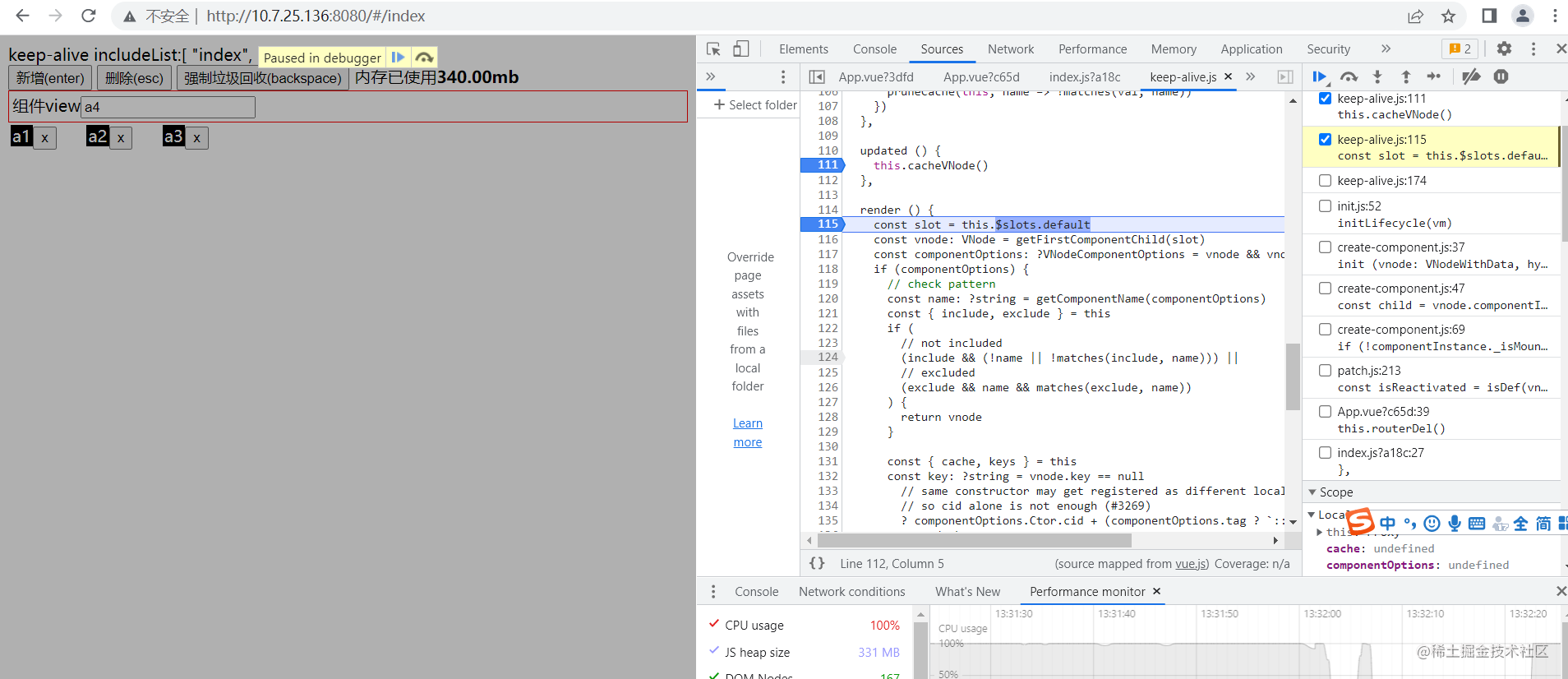 后面通过 performance 检查 发现内存飚到了1个多G, 可能是内存没有正常的回收,而项目是从多页面整合到单页面后发生的,单页面使用的是keepalive 内部页签实现。所以初步推断可能是内存挤爆了。