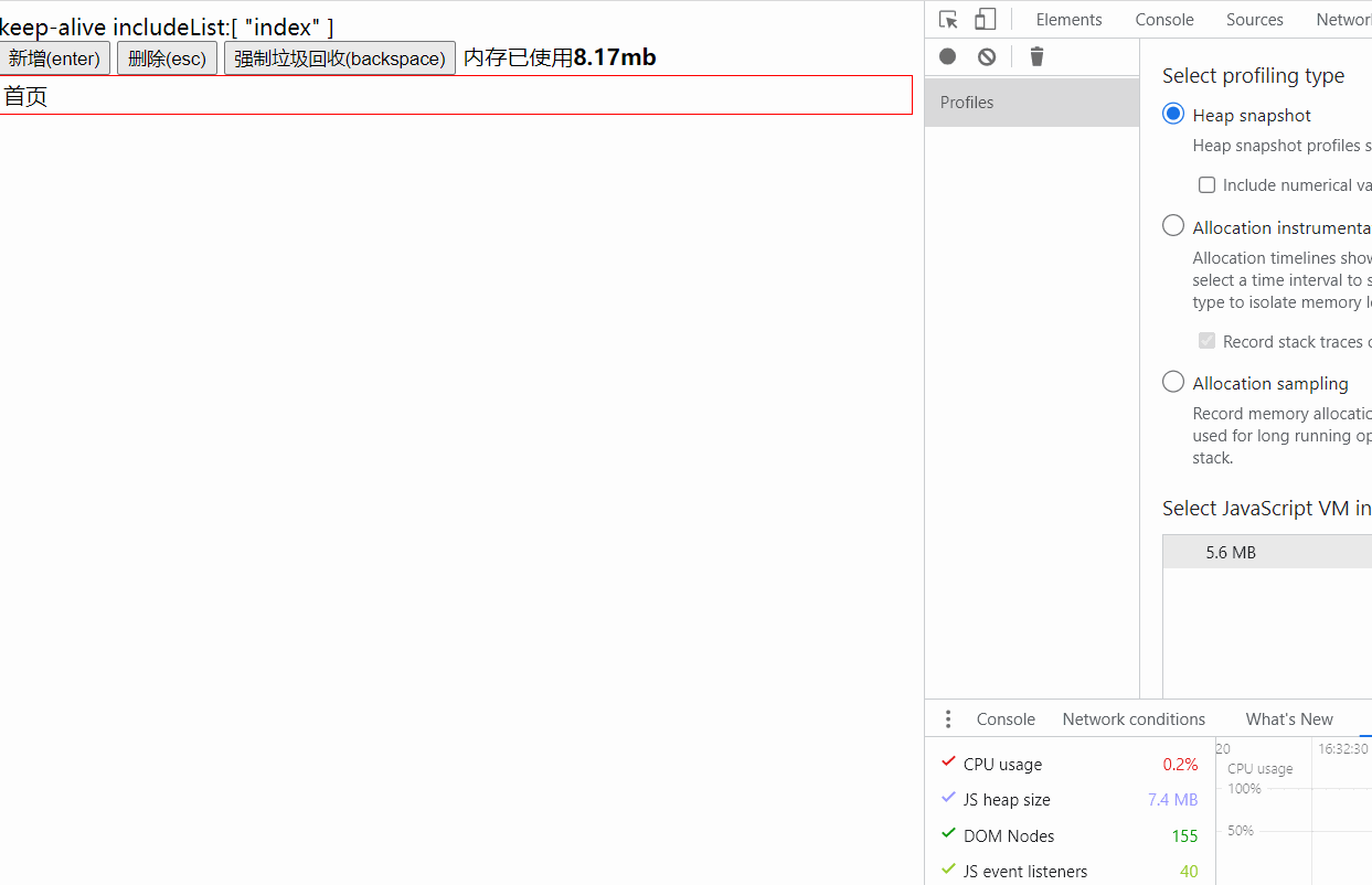 1.点击新增会创建一个80mb的组件,可以看到新增4个组件,keepalive占用大概330mb左右,(实时监控和performance接口计算,内存诊断报告会有偏差)