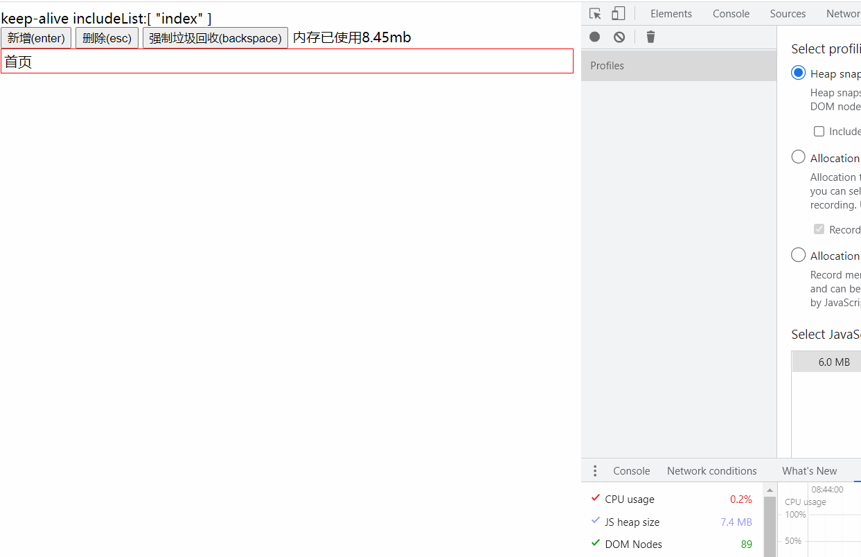 <template><div><div>keep-alive includeList:{{indexNameList}}</div><button @click="routerAdd()">新增(enter)</button> <button @click="routerDel()">删除(esc)</button> <button @click="gc()">强制垃圾回收(backspace)</button> <span>内存已使用<b id="usedJSHeapSize"></b></span><div class="keepaliveBox"><keep-alive :include="indexNameList"><router-view /></keep-alive></div><div class="barBox"><div class="box" v-for="(index) in indexList" :key="index"><span @click="routerClick(index)">a{{index}}</span><button @click="routerDel(index)" title="删除(esc)">x</button></div></div></div>