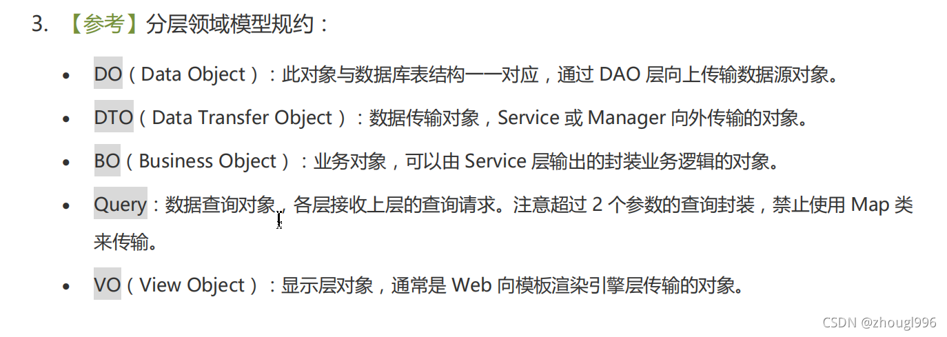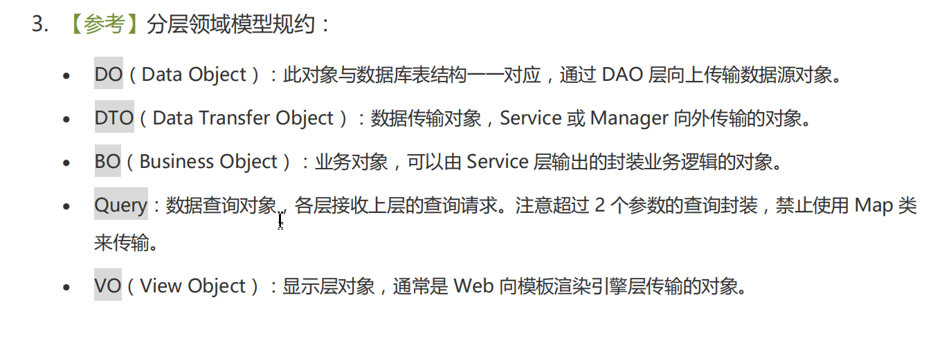 - Query:数据查询对象,各层接收上层的查询请求。 注意超过2个参数的查询封装,禁止使用Map类来传输。