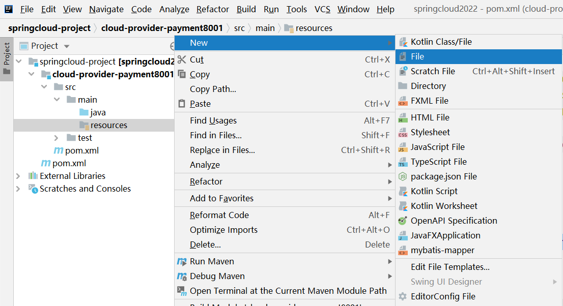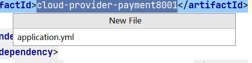 1 在cloud-provider-payment8001模块中新增application.yml文件,在resources右键新建文件