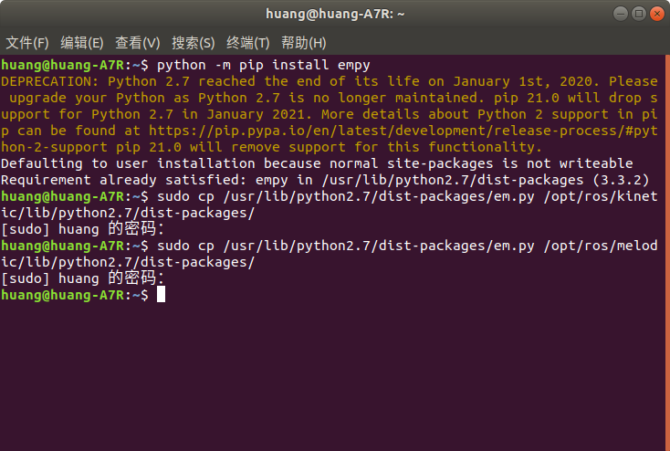 运行了python -m pip install empy命令后,发现empy是成功地安装在了/usr/lib/python2.7/dist-packages/em.py中,而不是编译时报错的/opt/ros/kinetic/lib/python2.7/dist-packages/中,因此尝试是否可以将empy.py文件从/usr复制到/ros中去: