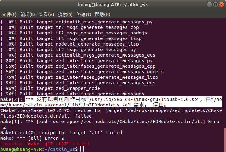 - *** 没有规则可制作目标“/usr/lib/x86_64-linux-gnu/libusb-1.0.so”,由“/home/huang/catkin_ws/devel/lib/libZEDNodelets.so” 需求。 停止。