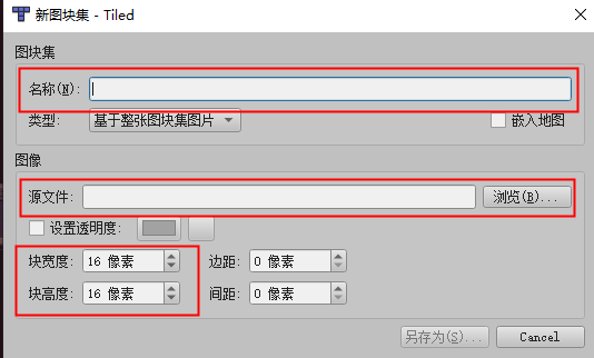 新建图块集,填写名称,寻找需要的图片源文件,设置块的高度和宽度,这里建议跟地图一致。