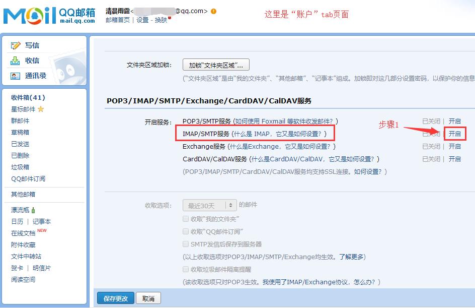 (3)在“账户”tab页中,找到IMAP和SMTP服务开启的地方,并点击“开启”按钮