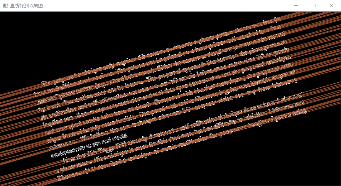 由于需要求解直线的倾斜角度,因此这里使用了HoughLines函数,返回的是直线的步长和弧度(极坐标系下)