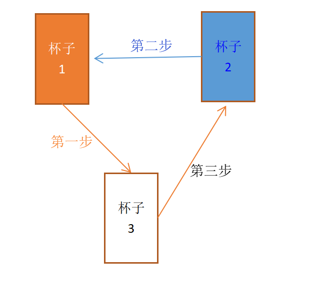 简答的问题:如果现在由两杯水,要想使这两杯水互换一下,最先想到的就是再拿出第三个杯子,先把一个杯子的水倒入第三个杯子中,再把另一个杯子的水倒入这个空杯子,然后再把第三个杯子的水倒入第二个杯子里面。