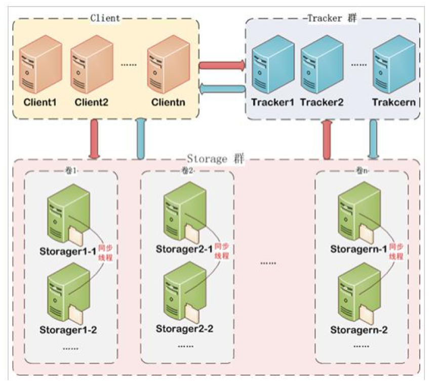 Storage:实际保存文件 Storage分为多个组,每个组之间保存的文件是不同的。每个组内部可以有多个成员,组成员内部保存的内容是一样的,组成员的地位是一致的,没有主从的概念。