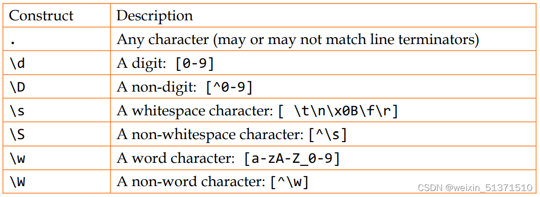 .任何单个字符\d任何数字(即[0-9])\s任何空白字符,包括空格、制表符、换页符等\w任何字符包括下划线 (等价于[a-zA-Z_0-9])\转义运算符 ,使其与字面上匹配(在Java中写需要两个\\一个给Java语言检查,一个给语法解析用)