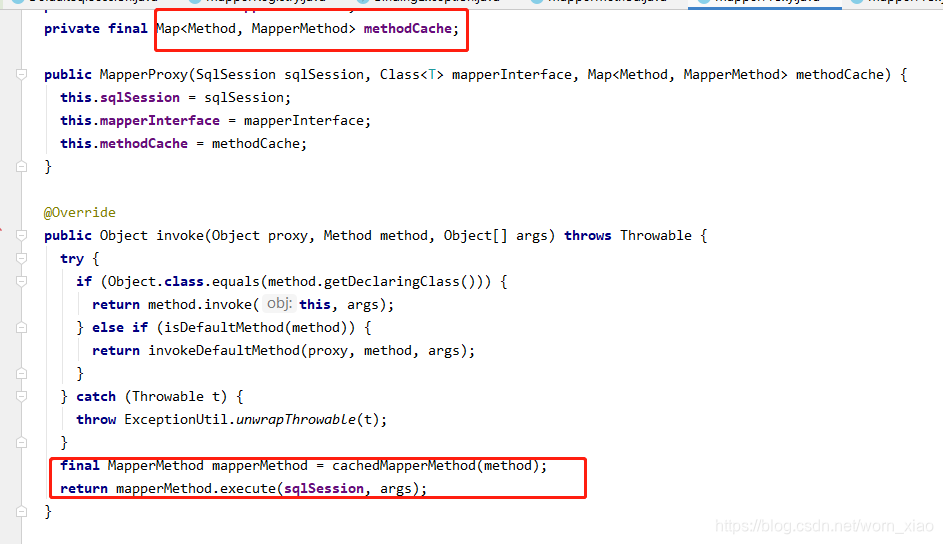 再往下看,可以看到通过newInstance()方法获取到一个MapperProxy的代理,然后通过代理执行mapper的方法。那么代理做了什么呢。我们点进代理看