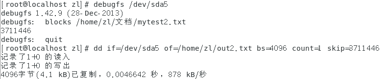 /root/out.txt文件内容就是从块号中读到的内容 bs是块大小(这里为4K) count表示连续读几块 skip是从第几块开始读