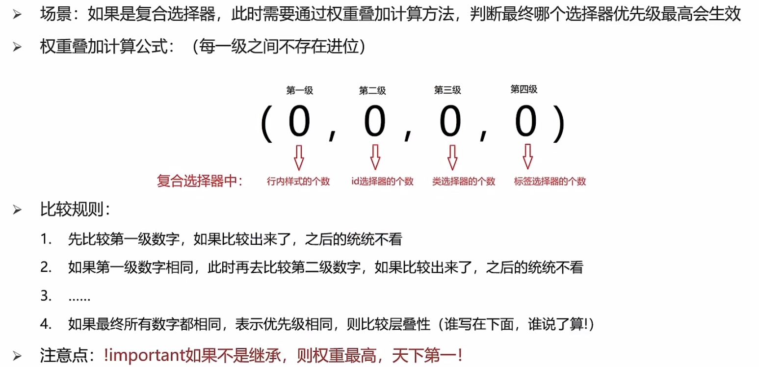 特性:不同选择器具有不同的优先级 优先级高的选择器样式会覆盖优先级低的选择器样式