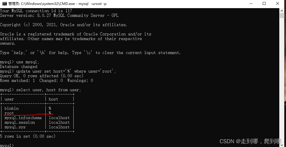 3.4 user 代表mysql服务可访问的用户,host代表用户运行在制定的ip上访问(localhost,表示本机)修改root用户允许在任务机器上访问 update user set host='%' where user='root';