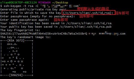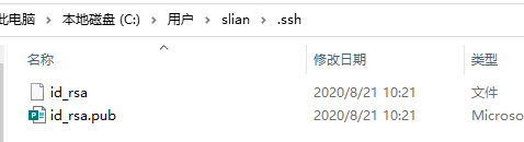 如上图,密钥生成的路径为/c/Users/slian/.ssh/id_rsa。大家对照自己的生成路径,找到自己的密钥文件id_rsa和id_rsa.pub分别为私钥和公钥