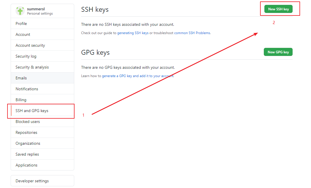 登录你的github,点Settings--->SSH and GPGkeys--->New SSH key