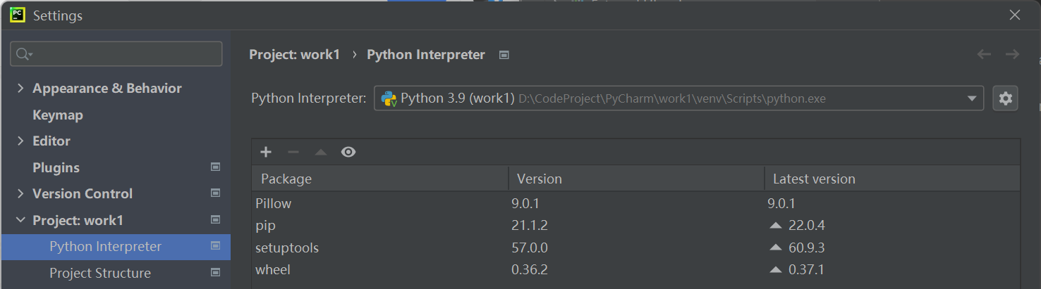 新建Project:work1,在Pycharm中设置File->Settings->Project->Python Interpreter中添加Pillow库。