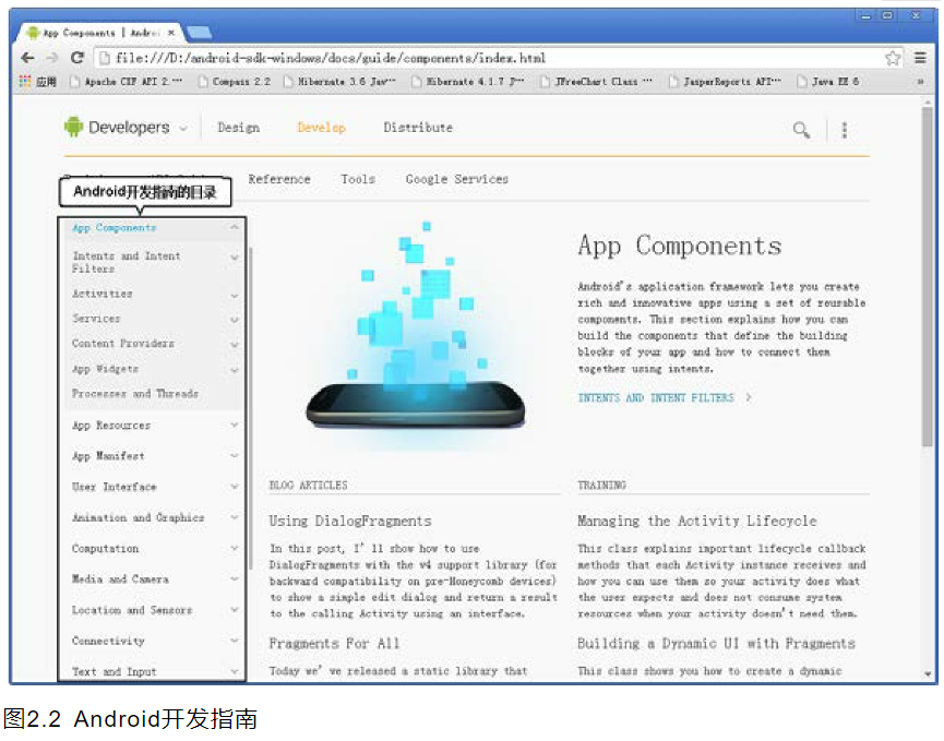 图2.2所示就是Android官方提供的开发指南文档,这份文档也是笔者当初学习、开发Android应用的重要文档。