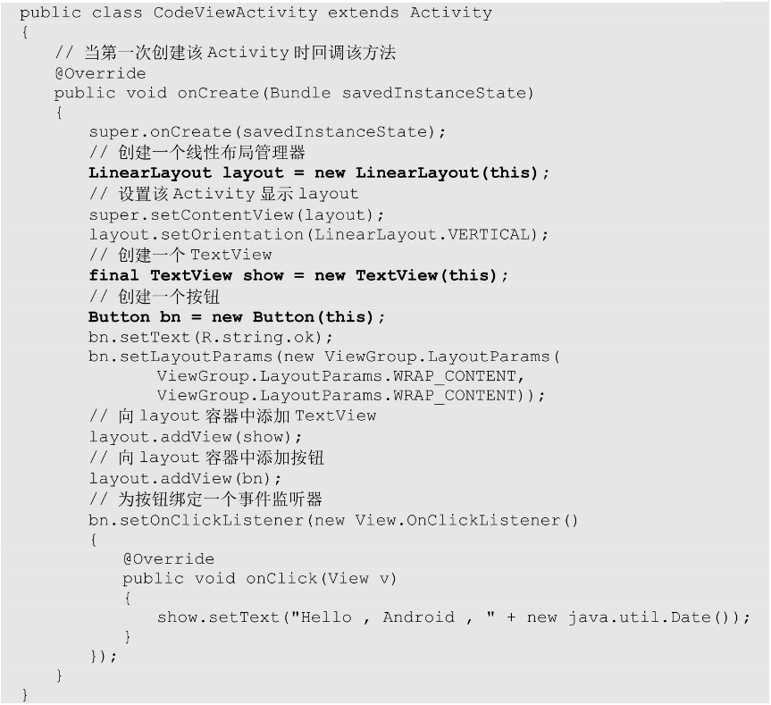 前面已经提到,完全使用Java代码来控制UI界面不仅烦琐,而且不利于解耦;而完全利用XML布局文件来控制U|界面虽然方便、便捷,但难免有失灵活。因此有些时候,可能需要混合使用XML布局文件和代码来控制UI界面。