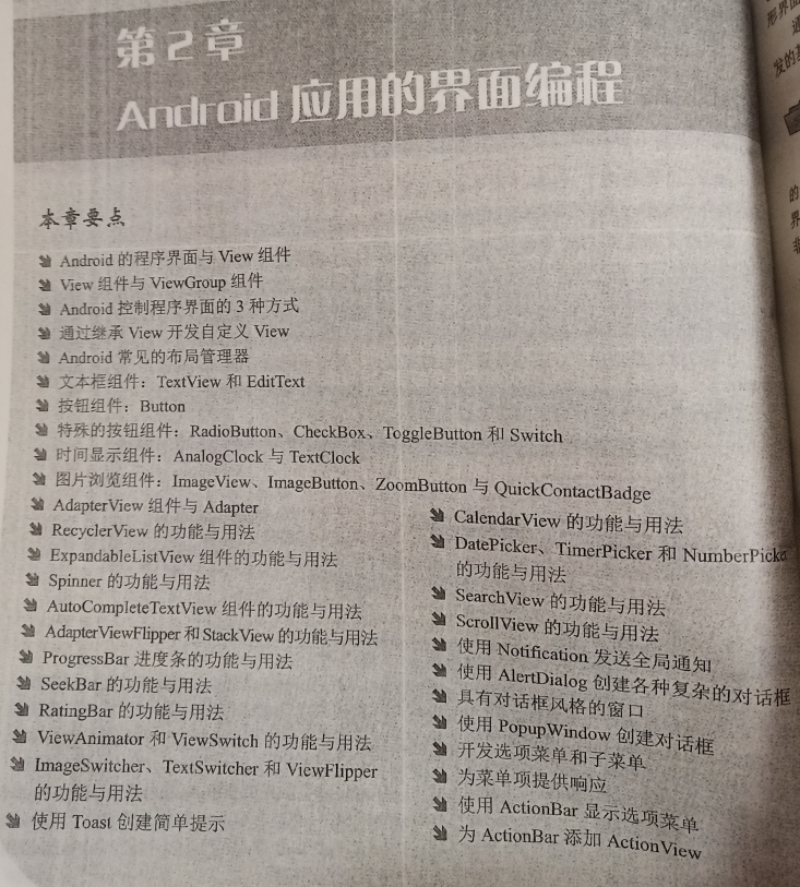 这里主要针对一些控件和布局的使用,篇幅会有点长。而且,不会像第一章一样全部详细列出。本章主要会用知识点的方式展示内容。