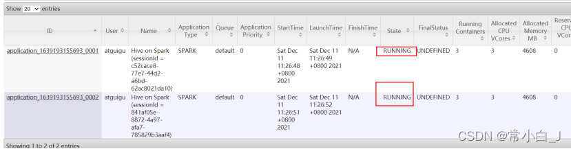 重新在两个窗口提交insert,查看web页面,两个application状态均为RUNNING: