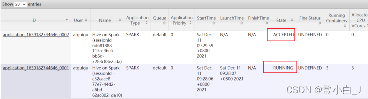所以在yarn运行的第一步是先找一个container运行applicationMaster,如果applicationMaster可以运行,就是RUNNING状态,如果不可以运行就是ACCEPTED状态。