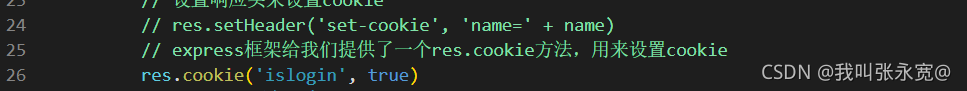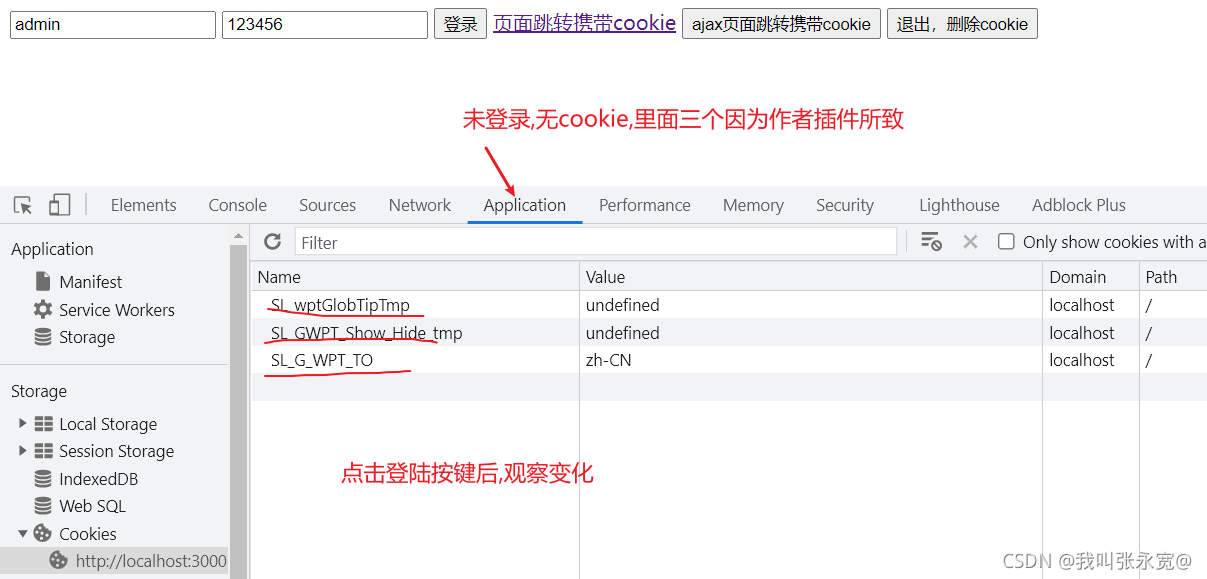 <!DOCTYPE html> <html lang="en"> <head> <meta charset="UTF-8" /> <meta name="viewport" content="width=device-width, initial-scale=1.0" /> <meta http-equiv="X-UA-Compatible" content="ie=edge" /> <title>Document</title> </head> <body> <input type="text" id="username" name="name" value="admin" /> <input type="text" id="password" name="password" value="123456" /> <button id="btn_keyvalue">登录</button> <a href="./testcookie" target="_blank">页面跳转携带cookie</a> <button id="btn_testCookie">ajax页面跳转携带cookie</button> <button id="btn_delCookie">退出,删除cookie</button> <script src="https://cdn.bootcdn.net/ajax/libs/jquery/3.6.0/jquery.min.js"></script> <script> // 用户退出,验证删除cookie的功能 $('#btn_delCookie').click(function () { $.ajax({ type: 'get', url: 'http://localhost:3000/quit', success(res) { console.log(res) }, }) }) // 测试cookie的效果 $('#btn_testCookie').click(function () { $.ajax({ type: 'get', url: 'http://localhost:3000/testcookie', success(res) { console.log(res) }, }) }) // 用户登录 $('#btn_keyvalue').click(function () { $.ajax({ type: 'post', url: 'http://localhost:3000/login', data: { name: $('#username').val(), password: $('#password').val(), }, success(res) { console.log(res) }, }) }) </script> </body> </html>- server.js代码