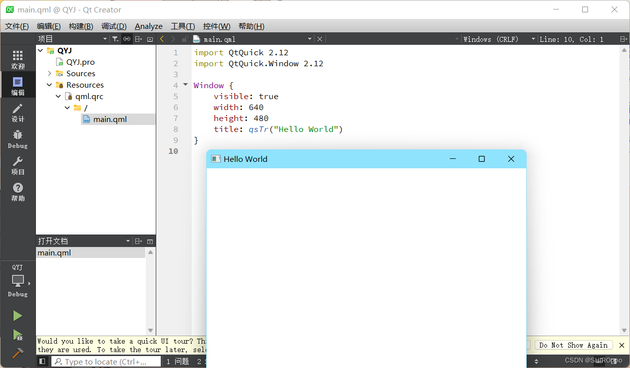 - 添加文件:qml.qrc–>/–>右键–>添加文件