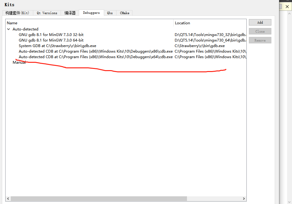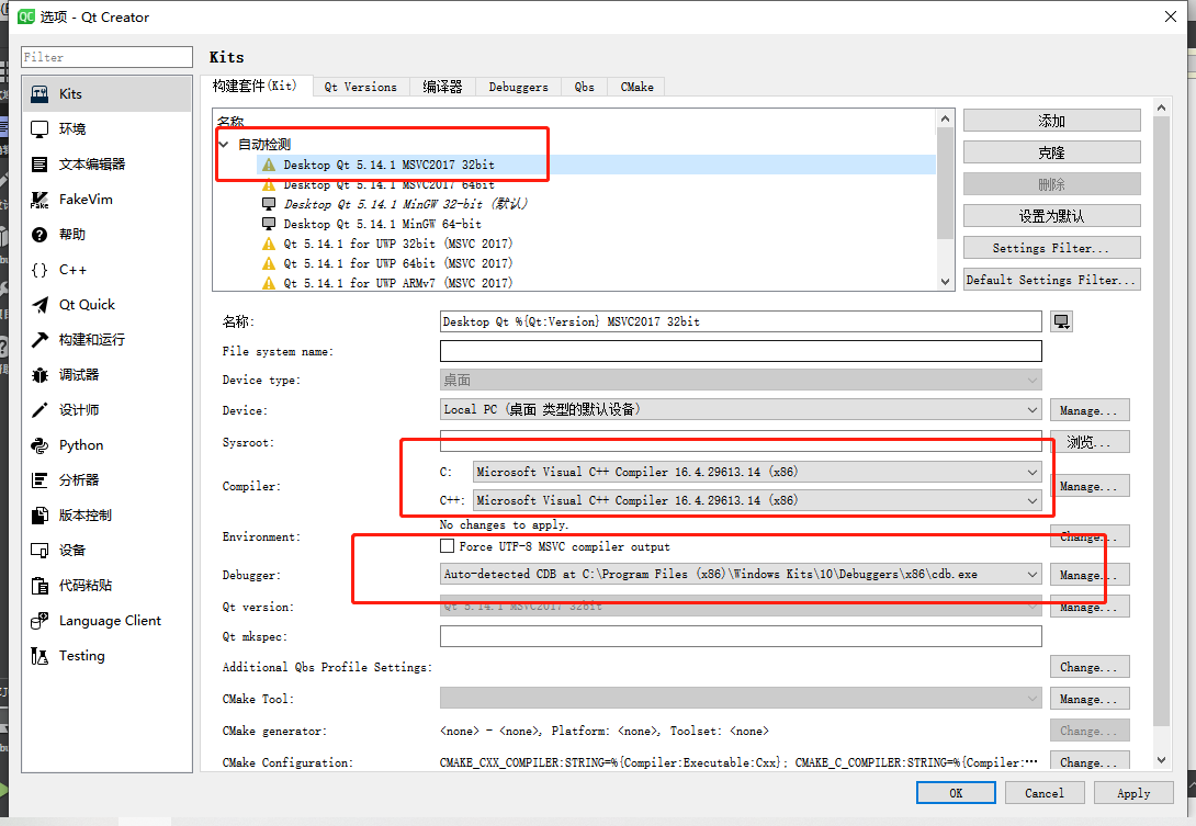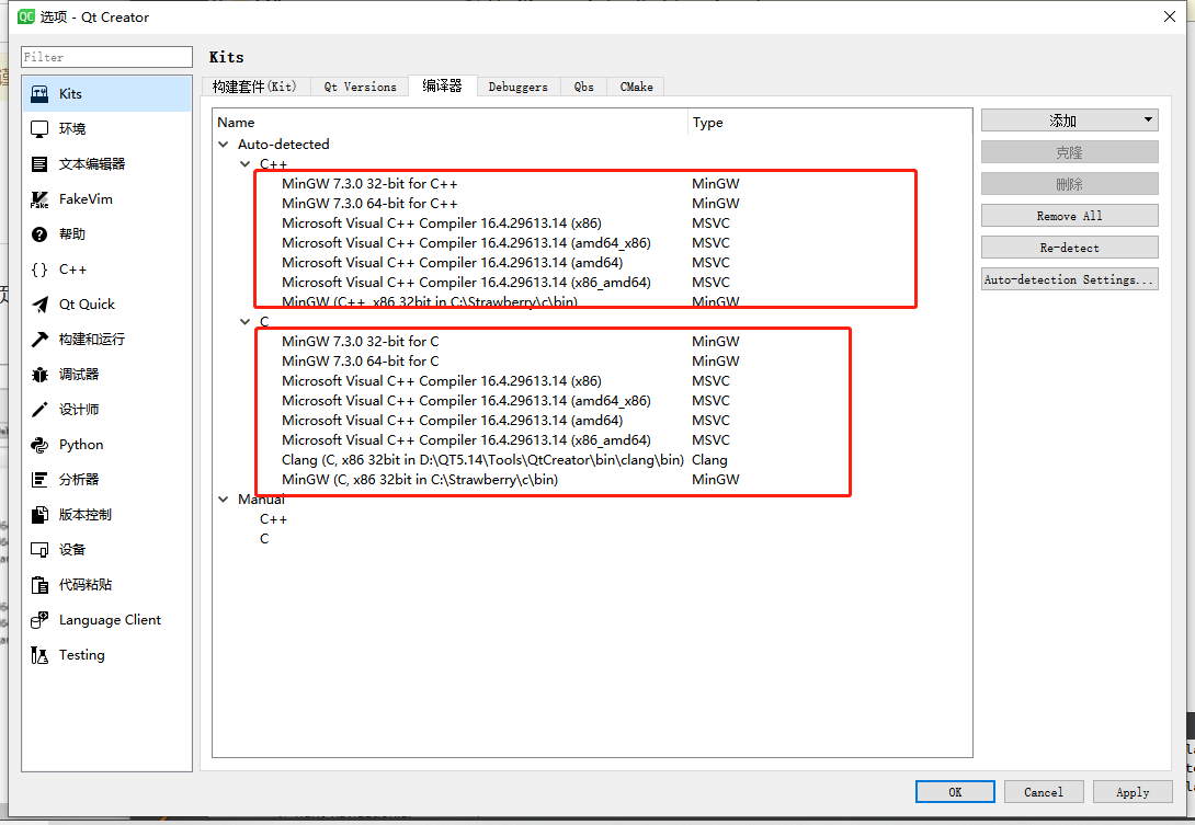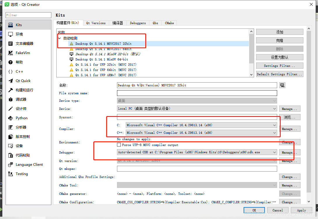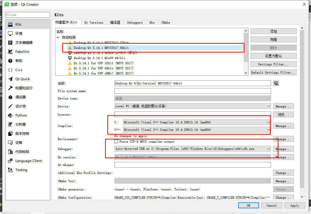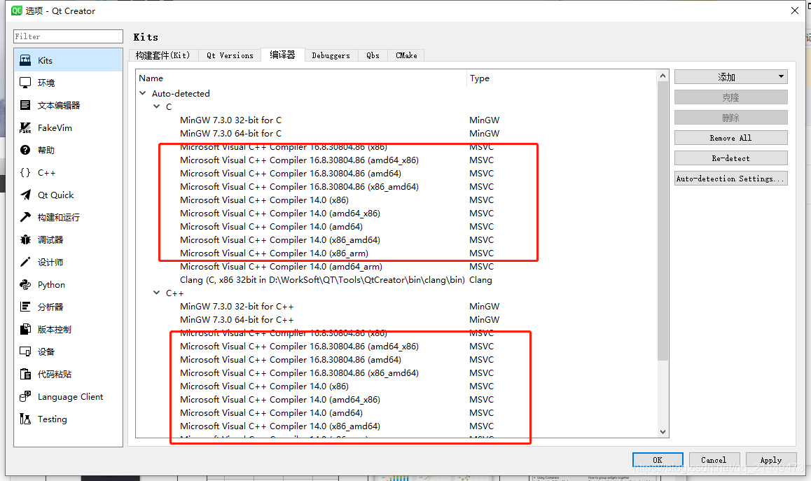 先是工具——>选项——>Kits 打开编译器,可以看到QT已经自动识别出来了MSVC的编译工具