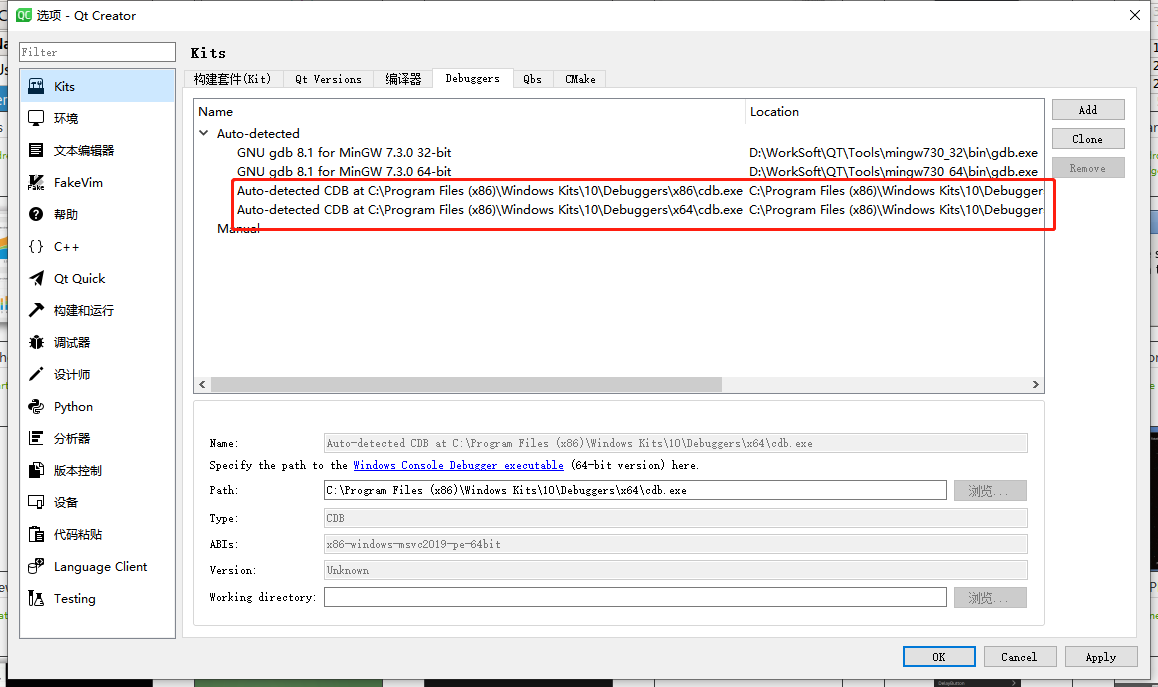 再在Debuggers中看QT有没有自动识别到cdb的路径
