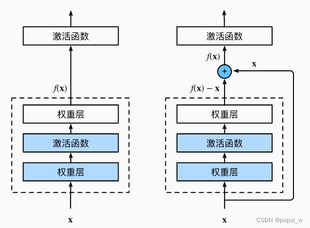 残差网络的核心思想是:每个附加层都应该更容易地包含原始函数作为其元素之一。如图是一个正常块(左)和一个残差块(右)的结构,可以看出在残差块中,输入可通过跨层数据线路更快地向前传播。