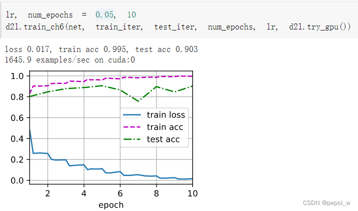 d2l.train_ch6(net, train_iter, test_iter, num_epochs, lr, d2l.try_gpu())运行结果:
