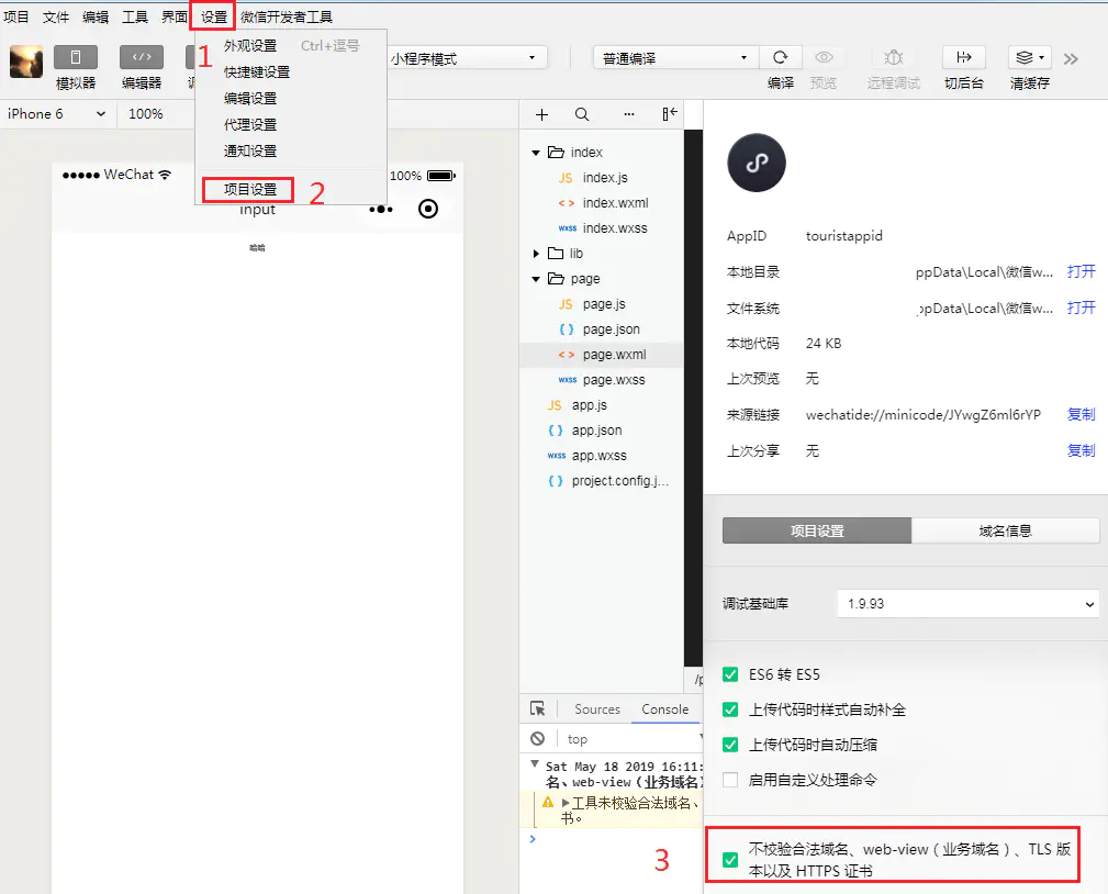 注:当在微信开发中工具里返回“{"base_resp":{"ret":-1}}”时,需要点左上角“设置”--“项目设置”--勾选“不校验合法域名、web-view(业务域名)、TLS 版本以及 HTTPS 证书”