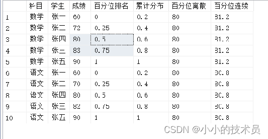 PERCENTILE_DISC(0.6) WITHIN GROUP(ORDER BY 成绩 ASC) OVER(PARTITION BY 科目) 百分位离散,