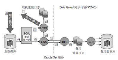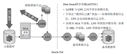 主数据库的LGWR进程将重做数据写入到自己的ORL,同时DataGuard的LNS (Log Network Server)进程捕获日志写入器写入的重做数据,并以同步或异步方式将重做数据传输到备用数据库。