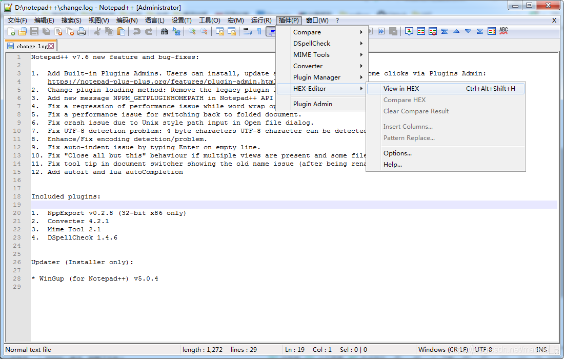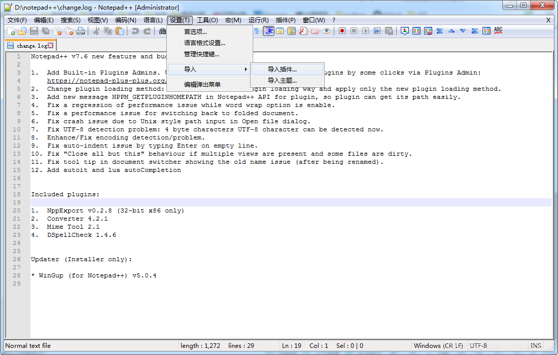 目前我用的是notepad++ 7.6版本,百度上说一拖进去然后重启实现的,必须是特定的版本。