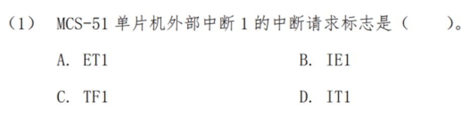 MCS-51单片机外部中断1(INT1)的中断请求标志是位于TCON中的IE1/TCON.3.所以本题正确答案为B.