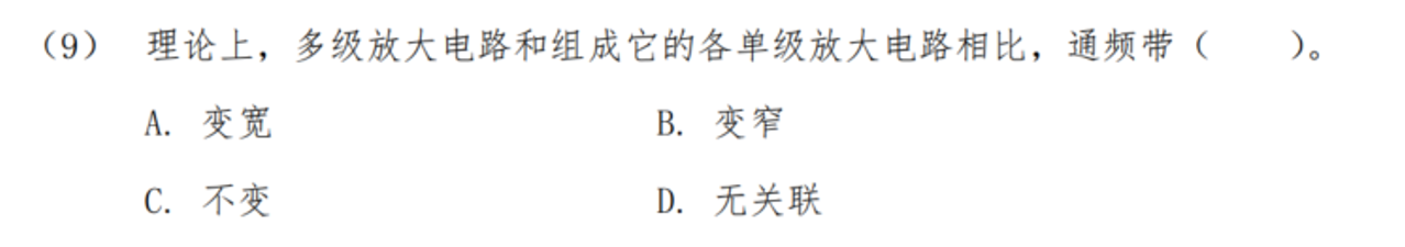 多级放大电路对的放大倍数与通频带是一对矛盾,多级放大电路虽然使放大倍数提高了,但通频带却变窄了,且级数越多,通频带越窄。所以本题正确答案为B