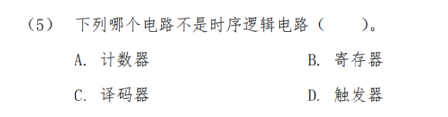 寄存器,计数器都具有存储能力,因此二者都是时序逻辑电路,触发器是属于最基本的时序逻辑电路,而译码器是一个多输入多输出的组合逻辑电路 ,所以本题正确答案为C