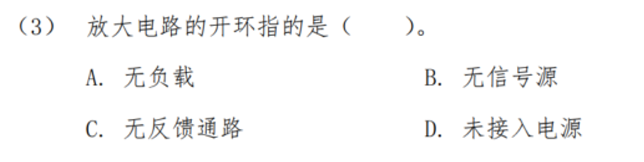 开环是指放大电路的输入端和输出端之间除了主信号通路外,没有任何的反馈元件或者反馈通路。 所以放大电路的开环指的是:无反馈通路,所以本题正确答案为C.