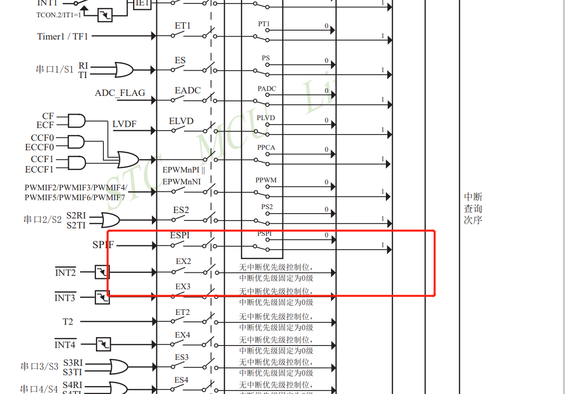 根据用户手册查表发现,B的前半句是对的,但根据中断结构图发现,并不是所有中断源均有2个中断优先级
