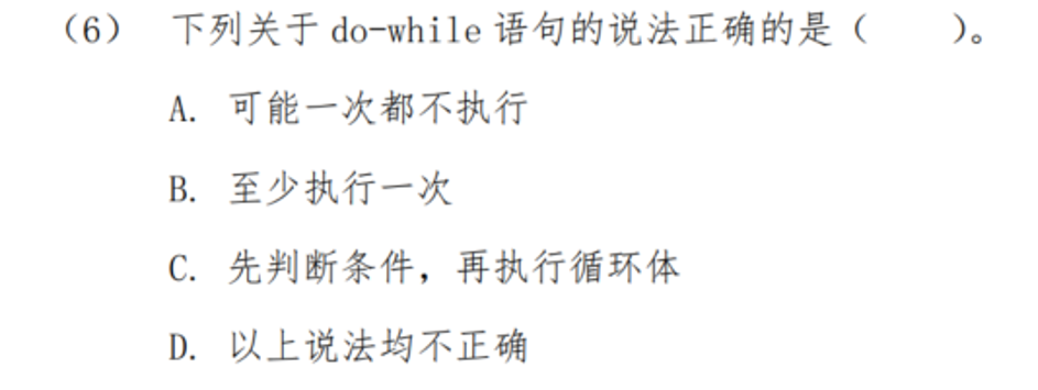 do-while语句,先执行一次后判断条件,如果条件不满足就退出循环,条件满足继续执行循环体里的内容。所以本题正确答案为B